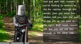 This game was designed to teach induction and refinement skills for identifying Either/Or and Slippery Slope Fallacies.